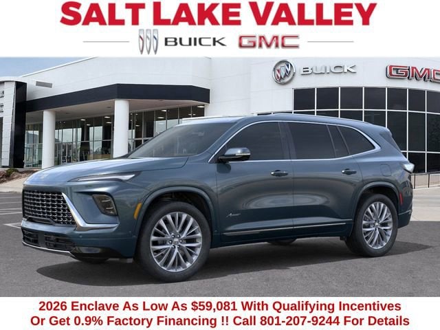 2026 Buick Enclave Avenir 4D Sport Utility ocean blue metallic 2.5L DOHC AWD --- Please note that the final selling price does not include tax, tag, title, documentation fees, dealer-installed options, or pricing adjustments due to market demand. Financing through GM Financial is required for all discounts to be applied. Special finance offers may not be combined with some factory incentives. While we strive for accuracy, errors may occur, so please verify all information with a customer service representative. For the most accurate pricing, call us at (801) 265-1511 or visit our dealership in person. Prices and payments are subject to change based on manufacturer incentives. ... Sale Price may include dealer discount, $250 - Buick GMC Bonus Cash $500 - Buick & GMC Consumer Cash Program - Price includes $1,000 Down Payment Assistance. Must Finance with GM Financial Price includes $1,500 Trade-In Allowance for customers trading a 2019 or newer passenger car or truck with under 80,000 miles toward a new 2025 2026 Buick or GMC. Branded or salvage title vehicles do not qualify. Some restrictions apply. See dealer for details.