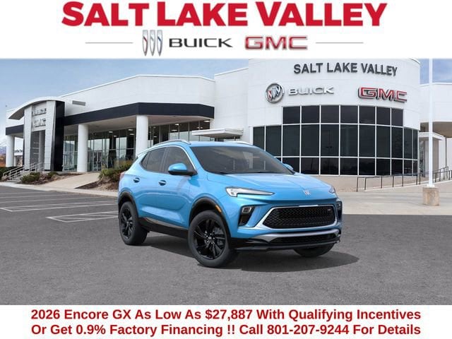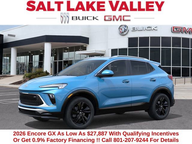 2026 Buick Encore GX Sport Touring 4D Sport Utility Aquamarine Blue Metallic ECOTEC 1.3L Turbo AWD 26/28 City/Highway MPG --- Please note that the final selling price does not include tax, tag, title, documentation fees, dealer-installed options, or pricing adjustments due to market demand. Financing through GM Financial is required for all discounts to be applied. Special finance offers may not be combined with some factory incentives. While we strive for accuracy, errors may occur, so please verify all information with a customer service representative. For the most accurate pricing, call us at (801) 265-1511 or visit our dealership in person. Prices and payments are subject to change based on manufacturer incentives. - Price includes $1,500 trade in allowance program for customers that own a 2018 or newer passenger car or truck with less than 80,000 miles and trade in their vehicle towards the purchase of a new 2025-2026 Buick or GMC. Some restrictions may apply. Contact dealer for details - Price includes $1,000 Down Payment Assistance. Must Finance with GM Financial
