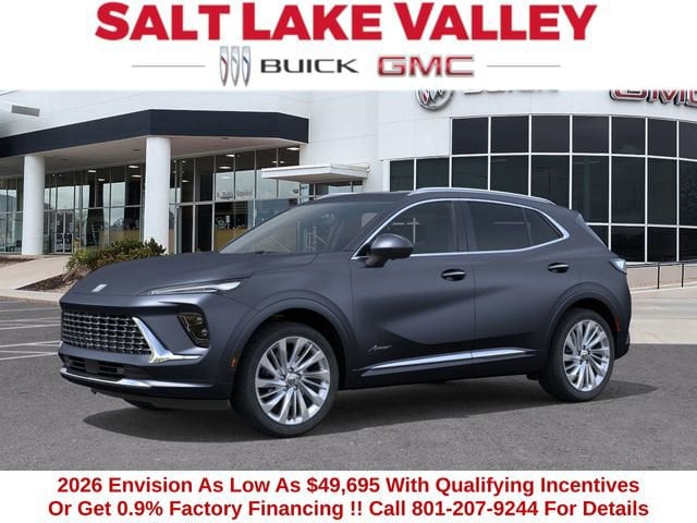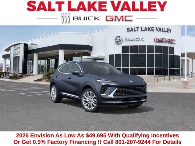 2026 Buick Envision Avenir 4D Sport Utility Quartz Blue Metallic 2.0L Turbocharged AWD 22/28 City/Highway MPG --- Please note that the final selling price does not include tax, tag, title, documentation fees, dealer-installed options, or pricing adjustments due to market demand. Financing through GM Financial is required for all discounts to be applied. Special finance offers may not be combined with some factory incentives. While we strive for accuracy, errors may occur, so please verify all information with a customer service representative. For the most accurate pricing, call us at (801) 265-1511 or visit our dealership in person. Prices and payments are subject to change based on manufacturer incentives. ... Sale Price may include dealer discount, $500 - Buick GMC Bonus Cash - Price includes $1,000 Down Payment Assistance. Must Finance with GM Financial Price includes $1,500 Trade-In Allowance for customers trading a 2019 or newer passenger car or truck with under 80,000 miles toward a new 2025 2026 Buick or GMC. Branded or salvage title vehicles do not qualify. Some restrictions apply. See dealer for details.