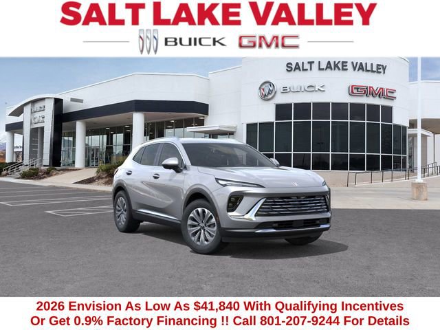 2026 Buick Envision Preferred 4D Sport Utility Moonstone Gray Metallic 2.0L Turbocharged AWD 22/28 City/Highway MPG --- Please note that the final selling price does not include tax, tag, title, documentation fees, dealer-installed options, or pricing adjustments due to market demand. Financing through GM Financial is required for all discounts to be applied. Special finance offers may not be combined with some factory incentives. While we strive for accuracy, errors may occur, so please verify all information with a customer service representative. For the most accurate pricing, call us at (801) 265-1511 or visit our dealership in person. Prices and payments are subject to change based on manufacturer incentives. ... Sale Price may include dealer discount, $500 - Buick GMC Bonus Cash - Price includes $1,000 Down Payment Assistance. Must Finance with GM Financial Price includes $1,500 Trade-In Allowance for customers trading a 2019 or newer passenger car or truck with under 80,000 miles toward a new 2025 2026 Buick or GMC. Branded or salvage title vehicles do not qualify. Some restrictions apply. See dealer for details.