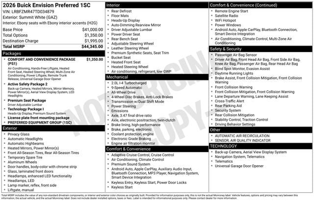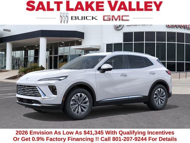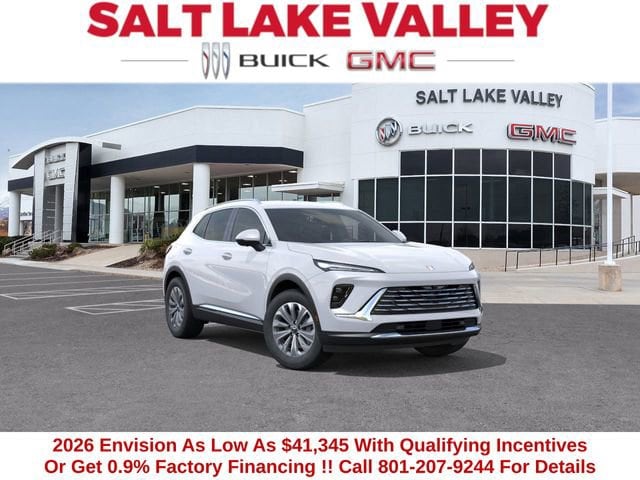 2026 Buick Envision Preferred 4D Sport Utility Summit White 2.0L Turbocharged AWD 22/28 City/Highway MPG --- Please note that the final selling price does not include tax, tag, title, documentation fees, dealer-installed options, or pricing adjustments due to market demand. Financing through GM Financial is required for all discounts to be applied. Special finance offers may not be combined with some factory incentives. While we strive for accuracy, errors may occur, so please verify all information with a customer service representative. For the most accurate pricing, call us at (801) 265-1511 or visit our dealership in person. Prices and payments are subject to change based on manufacturer incentives. ... Sale Price may include dealer discount, $500 - Buick GMC Bonus Cash - Price includes $1,000 Down Payment Assistance. Must Finance with GM Financial Price includes $1,500 Trade-In Allowance for customers trading a 2019 or newer passenger car or truck with under 80,000 miles toward a new 2025 2026 Buick or GMC. Branded or salvage title vehicles do not qualify. Some restrictions apply. See dealer for details.