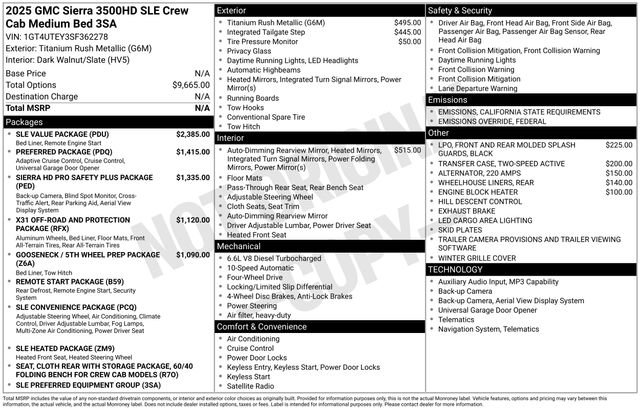 2025 GMC Sierra 3500HD SLE 4D Crew Cab Titanium Rush Metallic Duramax 6.6L V8 Turbodiesel 4WD --- Please note that the final selling price does not include tax, tag, title, documentation fees, dealer-installed options, or pricing adjustments due to market demand. Financing through GM Financial is required for all discounts to be applied. Special finance offers may not be combined with some factory incentives. While we strive for accuracy, errors may occur, so please verify all information with a customer service representative. For the most accurate pricing, call us at (801) 265-1511 or visit our dealership in person. Prices and payments are subject to change based on manufacturer incentives. ... Sale Price may include dealer discount, $1000 - Buick & GMC Consumer Cash Program - Price includes $1,500 trade in allowance program for customers that own a 2019 or newer passenger car or truck with less than 80,000 miles and trade in their vehicle towards the purchase of a new 2025-2026 Buick or GMC. Some restrictions may apply. Contact dealer for details - Price includes $2,000 Down Payment Assistance. Must Finance with GM Financial