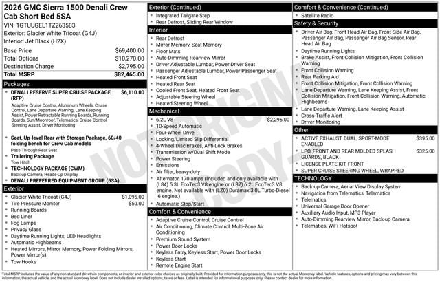 2026 GMC Sierra 1500 Denali 4D Crew Cab Glacier White Tricoat EcoTec3 6.2L V8 4WD --- Please note that the final selling price does not include tax, tag, title, documentation fees, dealer-installed options, or pricing adjustments due to market demand. Financing through GM Financial is required for all discounts to be applied. Special finance offers may not be combined with some factory incentives. While we strive for accuracy, errors may occur, so please verify all information with a customer service representative. For the most accurate pricing, call us at (801) 265-1511 or visit our dealership in person. Prices and payments are subject to change based on manufacturer incentives. ... Sale Price may include dealer discount, $1750 - Buick & GMC Consumer Cash Program $3500 - GM Trade In Allowance Program $500 - Buick GMC Bonus Cash