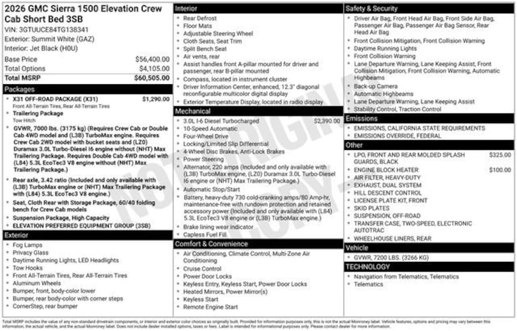 2026 GMC Sierra 1500 Elevation 4D Crew Cab Summit White 3.0L I6 4WD 22/26 City/Highway MPG --- Please note that the final selling price does not include tax, tag, title, documentation fees, dealer-installed options, or pricing adjustments due to market demand. Financing through GM Financial is required for all discounts to be applied. Special finance offers may not be combined with some factory incentives. While we strive for accuracy, errors may occur, so please verify all information with a customer service representative. For the most accurate pricing, call us at (801) 265-1511 or visit our dealership in person. Prices and payments are subject to change based on manufacturer incentives. ... Sale Price may include dealer discount, $1750 - Buick & GMC Consumer Cash Program $500 - GM Bonus Cash - Price includes $1,500 trade in allowance program for customers that own a 2018 or newer passenger car or truck with less than 80,000 miles and trade in their vehicle towards the purchase of a new 2025-2026 Buick or GMC. Some restrictions may apply. Contact dealer for details - Price includes $2,000 Down Payment Assistance. Must Finance with GM Financial
