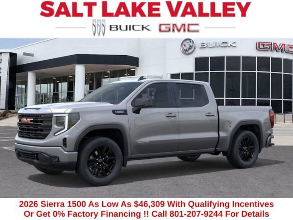 2026 GMC Sierra 1500 Elevation 4D Crew Cab Sterling Metallic 2.7L I4 Turbocharged DOHC 16V LEV3-SULEV30 310hp 4WD --- Please note that the final selling price does not include tax, tag, title, documentation fees, dealer-installed options, or pricing adjustments due to market demand. Financing through GM Financial is required for all discounts to be applied. Special finance offers may not be combined with some factory incentives. While we strive for accuracy, errors may occur, so please verify all information with a customer service representative. For the most accurate pricing, call us at (801) 265-1511 or visit our dealership in person. Prices and payments are subject to change based on manufacturer incentives. ... Sale Price may include dealer discount, $1500 - Buick & GMC Consumer Cash Program $1750 - GM Bonus Cash $250 - December Buick GMC Holiday Event Bonus Cash - Price includes $1,500 trade in allowance program for customers that own a 2018 or newer passenger car or truck with less than 80,000 miles and trade in their vehicle towards the purchase of a new 2025-2026 Buick or GMC. Some restrictions may apply. Contact dealer for details - Price includes $2,000 Down Payment Assistance. Must Finance with GM Financial