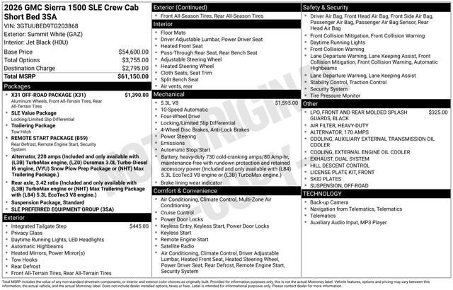 2026 GMC Sierra 1500 SLE 4D Crew Cab Summit White EcoTec3 5.3L V8 4WD --- Please note that the final selling price does not include tax, tag, title, documentation fees, dealer-installed options, or pricing adjustments due to market demand. Financing through GM Financial is required for all discounts to be applied. Special finance offers may not be combined with some factory incentives. While we strive for accuracy, errors may occur, so please verify all information with a customer service representative. For the most accurate pricing, call us at (801) 265-1511 or visit our dealership in person. Prices and payments are subject to change based on manufacturer incentives. ... Sale Price may include dealer discount, $1500 - Buick GMC Bonus Cash $1750 - Buick & GMC Consumer Cash Program $3000 - GM Trade In Allowance Program