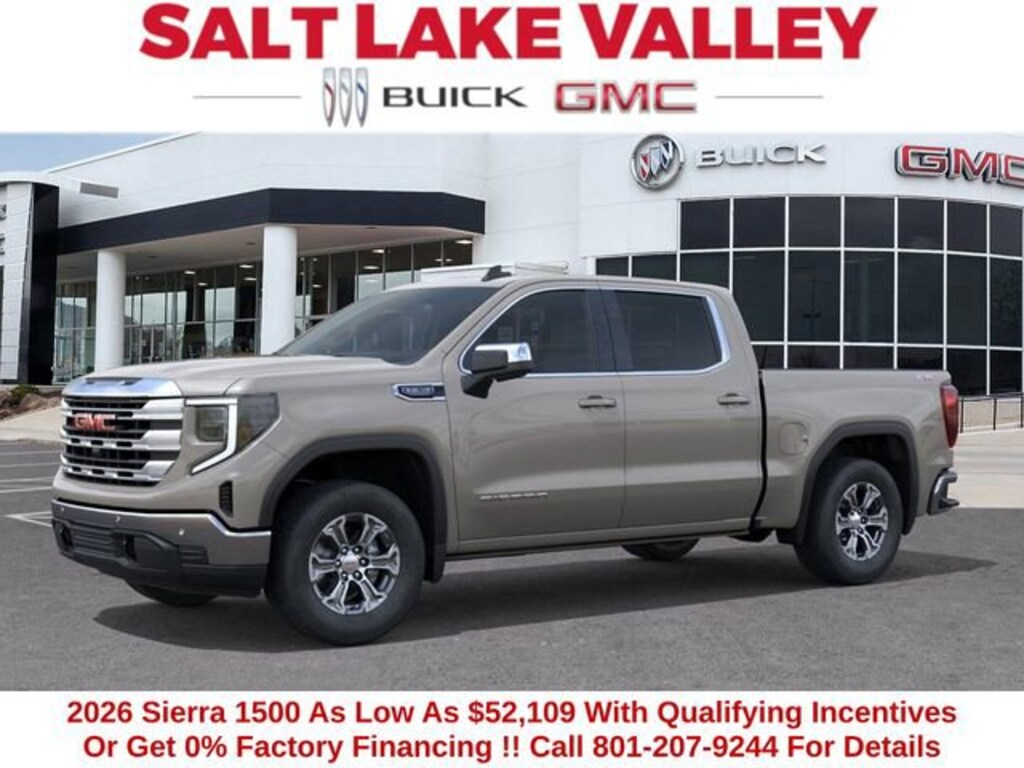 2026 GMC Sierra 1500 SLE 4D Crew Cab Coastal Dune EcoTec3 5.3L V8 4WD --- Please note that the final selling price does not include tax, tag, title, documentation fees, dealer-installed options, or pricing adjustments due to market demand. Financing through GM Financial is required for all discounts to be applied. Special finance offers may not be combined with some factory incentives. While we strive for accuracy, errors may occur, so please verify all information with a customer service representative. For the most accurate pricing, call us at (801) 265-1511 or visit our dealership in person. Prices and payments are subject to change based on manufacturer incentives. ... Sale Price may include dealer discount, $1500 - Buick & GMC Consumer Cash Program $1500 - GM Bonus Cash $250 - December Buick GMC Holiday Event Bonus Cash - Price includes $1,500 trade in allowance program for customers that own a 2018 or newer passenger car or truck with less than 80,000 miles and trade in their vehicle towards the purchase of a new 2025-2026 Buick or GMC. Some restrictions may apply. Contact dealer for details - Price includes $2,000 Down Payment Assistance. Must Finance with GM Financial