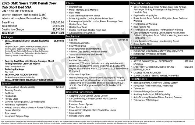 2026 GMC Sierra 1500 Denali 4D Crew Cab Titanium Rush Metallic EcoTec3 6.2L V8 4WD --- Please note that the final selling price does not include tax, tag, title, documentation fees, dealer-installed options, or pricing adjustments due to market demand. Financing through GM Financial is required for all discounts to be applied. Special finance offers may not be combined with some factory incentives. While we strive for accuracy, errors may occur, so please verify all information with a customer service representative. For the most accurate pricing, call us at (801) 265-1511 or visit our dealership in person. Prices and payments are subject to change based on manufacturer incentives. ... Sale Price may include dealer discount, $1750 - Buick & GMC Consumer Cash Program $500 - GM Bonus Cash - Price includes $1,500 trade in allowance program for customers that own a 2019 or newer passenger car or truck with less than 80,000 miles and trade in their vehicle towards the purchase of a new 2025-2026 Buick or GMC. Some restrictions may apply. Contact dealer for details - Price includes $2,000 Down Payment Assistance. Must Finance with GM Financial