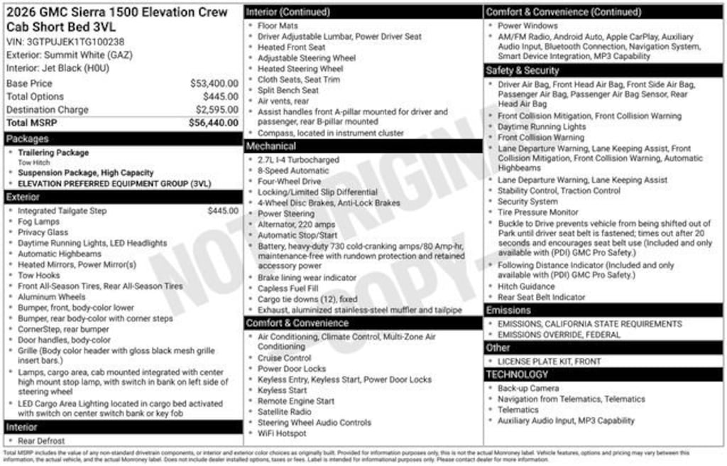 Take on every drive with confidence in the new GMC Sierra 1500 from Salt Lake Valley Buick GMC! Built for strength, style, and advanced capability, GMC delivers the perfect mix of power and precision. From city streets to Utah backroads, the Sierra 1500 is ready for anything. Contact us at 801-265-1511 today to schedule your test drive ! ---2026 GMC Sierra 1500 Elevation 4D Crew Cab Summit White 2.7L I4 Turbocharged DOHC 16V LEV3-SULEV30 310hp 4WD --- Please note that the final selling price does not include tax, tag, title, documentation fees, dealer-installed options, or pricing adjustments due to market demand. Financing through GM Financial is required for all discounts to be applied. Special finance offers may not be combined with some factory incentives. While we strive for accuracy, errors may occur, so please verify all information with a customer service representative. For the most accurate pricing, call us at (801) 265-1511 or visit our dealership in person. Prices and payments are subject to change based on manufacturer incentives. ... Sale Price may include dealer discount, $1500 - Buick & GMC Consumer Cash Program $1750 - GM Bonus Cash $250 - December GMC Sales Event LD Bonus Cash - Price includes $1,500 trade in allowance program for customers that own a 2018 or newer passenger car or truck with less than 80,000 miles and trade in their vehicle towards the purchase of a new 2025-2026 Buick or GMC. Some restrictions may apply. Contact dealer for details - Price includes $2,000 Down Payment Assistance. Must Finance with GM Financial