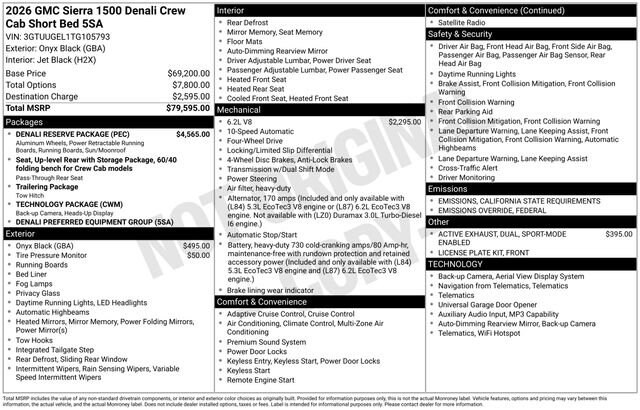 2026 GMC Sierra 1500 Denali 4D Crew Cab Onyx Black EcoTec3 6.2L V8 4WD --- Please note that the final selling price does not include tax, tag, title, documentation fees, dealer-installed options, or pricing adjustments due to market demand. Financing through GM Financial is required for all discounts to be applied. Special finance offers may not be combined with some factory incentives. While we strive for accuracy, errors may occur, so please verify all information with a customer service representative. For the most accurate pricing, call us at (801) 265-1511 or visit our dealership in person. Prices and payments are subject to change based on manufacturer incentives. ... Sale Price may include dealer discount, $1750 - Buick & GMC Consumer Cash Program $500 - GM Bonus Cash - Price includes $1,500 trade in allowance program for customers that own a 2019 or newer passenger car or truck with less than 80,000 miles and trade in their vehicle towards the purchase of a new 2025-2026 Buick or GMC. Some restrictions may apply. Contact dealer for details - Price includes $2,000 Down Payment Assistance. Must Finance with GM Financial