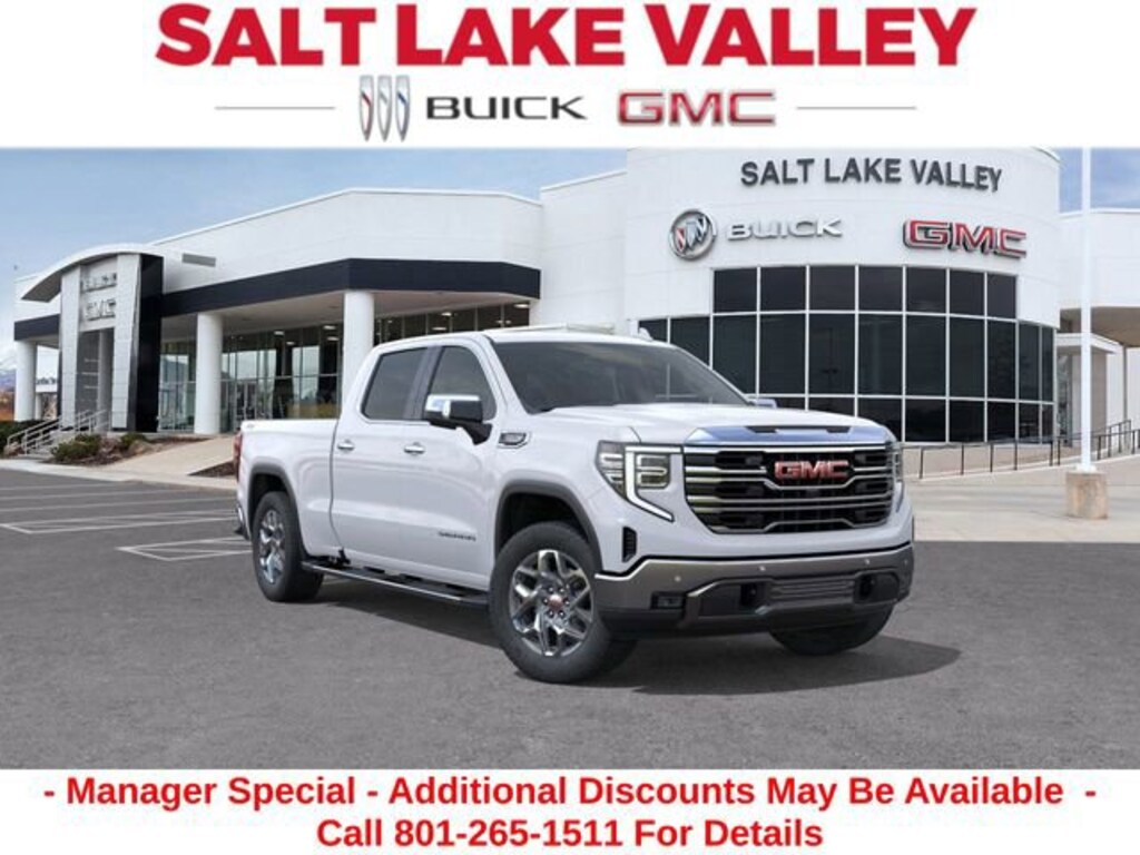 2026 GMC Sierra 1500 SLT 4D Crew Cab Summit White EcoTec3 6.2L V8 4WD --- Please note that the final selling price does not include tax, tag, title, documentation fees, dealer-installed options, or pricing adjustments due to market demand. Financing through GM Financial is required for all discounts to be applied. Special finance offers may not be combined with some factory incentives. While we strive for accuracy, errors may occur, so please verify all information with a customer service representative. For the most accurate pricing, call us at (801) 265-1511 or visit our dealership in person. Prices and payments are subject to change based on manufacturer incentives. ... Sale Price may include dealer discount, $1750 - Buick & GMC Consumer Cash Program - Price includes $1,000 Down Payment Assistance. Must Finance with GM Financial - - Price includes $1,500 trade in allowance program for customers that own a 2018 or newer passenger car or truck with less than 80,000 miles and trade in their vehicle towards the purchase of a new 2025-2026 Buick or GMC. Some restrictions may apply. Contact dealer for details
