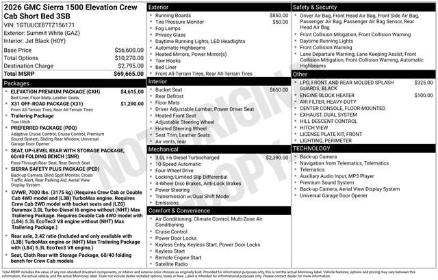 2026 GMC Sierra 1500 Elevation 4D Crew Cab Summit White 3.0L I6 4WD 22/26 City/Highway MPG --- Please note that the final selling price does not include tax, tag, title, documentation fees, dealer-installed options, or pricing adjustments due to market demand. Financing through GM Financial is required for all discounts to be applied. Special finance offers may not be combined with some factory incentives. While we strive for accuracy, errors may occur, so please verify all information with a customer service representative. For the most accurate pricing, call us at (801) 265-1511 or visit our dealership in person. Prices and payments are subject to change based on manufacturer incentives. ... Sale Price may include dealer discount, $1750 - Buick & GMC Consumer Cash Program $500 - Buick GMC Bonus Cash