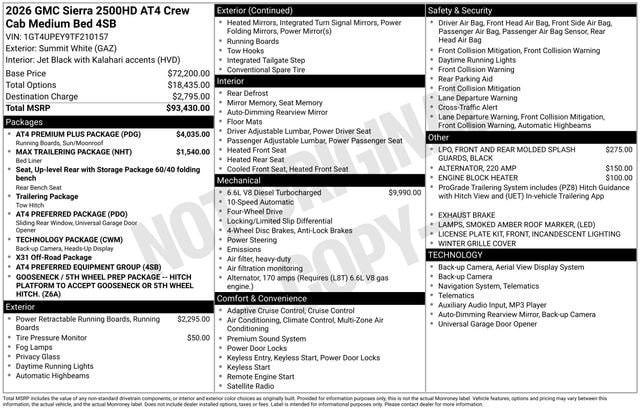 2026 GMC Sierra 2500HD AT4 4D Crew Cab Summit White Duramax 6.6L V8 Turbodiesel 4WD --- Please note that the final selling price does not include tax, tag, title, documentation fees, dealer-installed options, or pricing adjustments due to market demand. Financing through GM Financial is required for all discounts to be applied. Special finance offers may not be combined with some factory incentives. While we strive for accuracy, errors may occur, so please verify all information with a customer service representative. For the most accurate pricing, call us at (801) 265-1511 or visit our dealership in person. Prices and payments are subject to change based on manufacturer incentives. ... Sale Price may include dealer discount, $1000 - Buick & GMC Consumer Cash Program