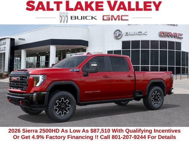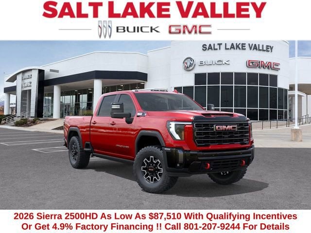 2026 GMC Sierra 2500HD AT4X 4D Crew Cab Volcanic Red Tintcoat Duramax 6.6L V8 Turbodiesel 4WD --- Please note that the final selling price does not include tax, tag, title, documentation fees, dealer-installed options, or pricing adjustments due to market demand. Financing through GM Financial is required for all discounts to be applied. Special finance offers may not be combined with some factory incentives. While we strive for accuracy, errors may occur, so please verify all information with a customer service representative. For the most accurate pricing, call us at (801) 265-1511 or visit our dealership in person. Prices and payments are subject to change based on manufacturer incentives. ... Sale Price may include dealer discount, $500 - Buick & GMC Consumer Cash Program - Price includes $2,000 Down Payment Assistance. Must Finance with GM Financial Price includes $1,500 Trade-In Allowance for customers trading a 2019 or newer passenger car or truck with under 80,000 miles toward a new 2025 2026 Buick or GMC. Branded or salvage title vehicles do not qualify. Some restrictions apply. See dealer for details.
