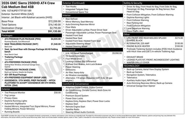 2026 GMC Sierra 2500HD AT4 4D Crew Cab Summit White Duramax 6.6L V8 Turbodiesel 4WD --- Please note that the final selling price does not include tax, tag, title, documentation fees, dealer-installed options, or pricing adjustments due to market demand. Financing through GM Financial is required for all discounts to be applied. Special finance offers may not be combined with some factory incentives. While we strive for accuracy, errors may occur, so please verify all information with a customer service representative. For the most accurate pricing, call us at (801) 265-1511 or visit our dealership in person. Prices and payments are subject to change based on manufacturer incentives. ... Sale Price may include dealer discount, $1000 - Buick & GMC Consumer Cash Program
