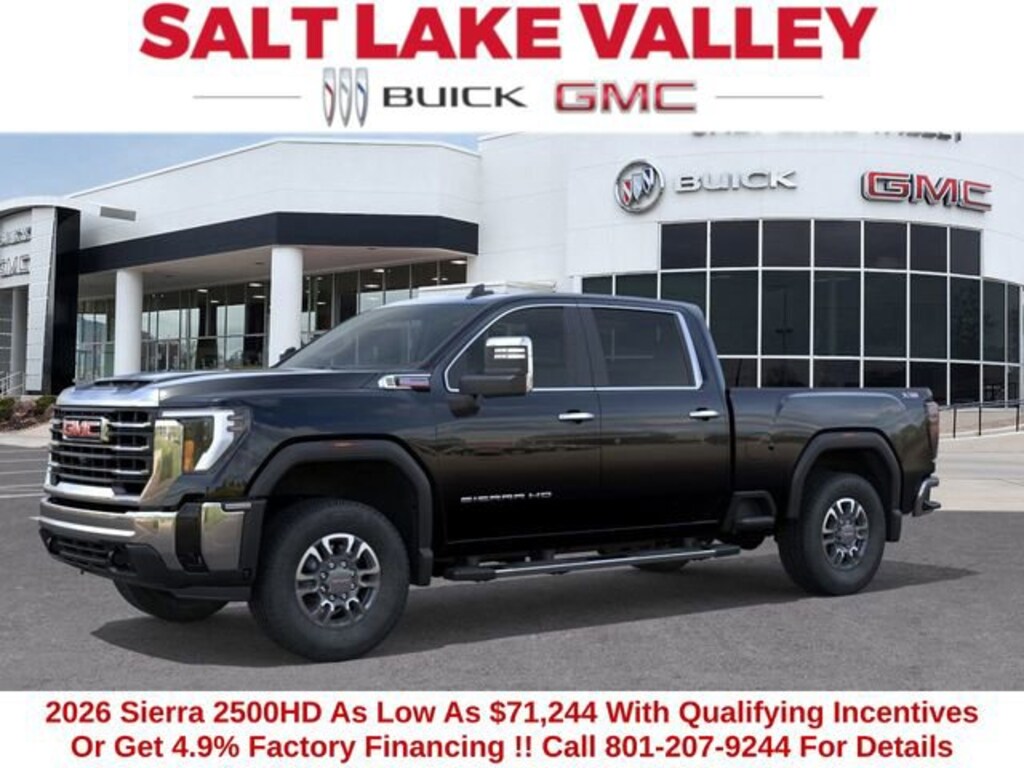 2026 GMC Sierra 2500HD SLT 4D Crew Cab Onyx Black Duramax 6.6L V8 Turbodiesel 4WD --- Please note that the final selling price does not include tax, tag, title, documentation fees, dealer-installed options, or pricing adjustments due to market demand. Financing through GM Financial is required for all discounts to be applied. Special finance offers may not be combined with some factory incentives. While we strive for accuracy, errors may occur, so please verify all information with a customer service representative. For the most accurate pricing, call us at (801) 265-1511 or visit our dealership in person. Prices and payments are subject to change based on manufacturer incentives. ... Sale Price may include dealer discount, $500 - Buick & GMC Consumer Cash Program - Price includes $1,500 trade in allowance program for customers that own a 2018 or newer passenger car or truck with less than 80,000 miles and trade in their vehicle towards the purchase of a new 2025-2026 Buick or GMC. Some restrictions may apply. Contact dealer for details - Price includes $2,000 Down Payment Assistance. Must Finance with GM Financial