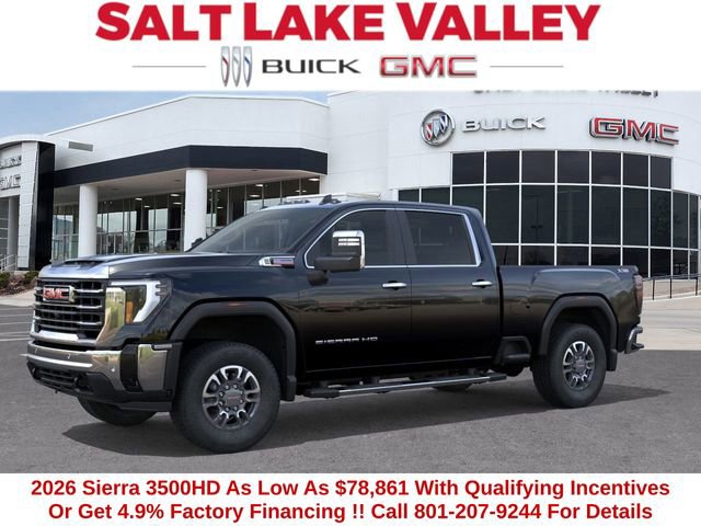 2026 GMC Sierra 3500HD SLT 4D Crew Cab Onyx Black Duramax 6.6L V8 Turbodiesel 4WD --- Please note that the final selling price does not include tax, tag, title, documentation fees, dealer-installed options, or pricing adjustments due to market demand. Financing through GM Financial is required for all discounts to be applied. Special finance offers may not be combined with some factory incentives. While we strive for accuracy, errors may occur, so please verify all information with a customer service representative. For the most accurate pricing, call us at (801) 265-1511 or visit our dealership in person. Prices and payments are subject to change based on manufacturer incentives. ... Sale Price may include dealer discount, $500 - Buick & GMC Consumer Cash Program $500 - Buick GMC Bonus Cash
