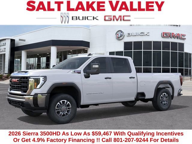 2026 GMC Sierra 3500HD Pro 4D Crew Cab Summit White Duramax 6.6L V8 Turbodiesel 4WD --- Please note that the final selling price does not include tax, tag, title, documentation fees, dealer-installed options, or pricing adjustments due to market demand. Financing through GM Financial is required for all discounts to be applied. Special finance offers may not be combined with some factory incentives. While we strive for accuracy, errors may occur, so please verify all information with a customer service representative. For the most accurate pricing, call us at (801) 265-1511 or visit our dealership in person. Prices and payments are subject to change based on manufacturer incentives. ... Sale Price may include dealer discount, $500 - Buick & GMC Consumer Cash Program - Price includes $2,000 Down Payment Assistance. Must Finance with GM Financial Price includes $1,500 Trade-In Allowance for customers trading a 2019 or newer passenger car or truck with under 80,000 miles toward a new 2025 2026 Buick or GMC. Branded or salvage title vehicles do not qualify. Some restrictions apply. See dealer for details.