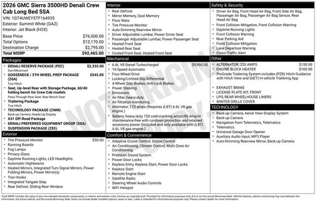 2026 GMC Sierra 3500HD Denali 4D Crew Cab Summit White Duramax 6.6L V8 Turbodiesel 4WD --- Please note that the final selling price does not include tax, tag, title, documentation fees, dealer-installed options, or pricing adjustments due to market demand. Financing through GM Financial is required for all discounts to be applied. Special finance offers may not be combined with some factory incentives. While we strive for accuracy, errors may occur, so please verify all information with a customer service representative. For the most accurate pricing, call us at (801) 265-1511 or visit our dealership in person. Prices and payments are subject to change based on manufacturer incentives. ... Sale Price may include dealer discount, $1000 - Buick & GMC Consumer Cash Program