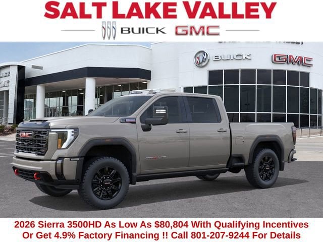 Take on every drive with confidence in the new GMC Sierra 3500HD from Salt Lake Valley Buick GMC! Built for strength, style, and advanced capability, GMC delivers the perfect mix of power and precision. From city streets to Utah backroads, the Sierra 3500HD is ready for anything. Contact us at 801-265-1511 today to schedule your test drive ! ---2026 GMC Sierra 3500HD AT4 4D Crew Cab White Sands Duramax 6.6L V8 Turbodiesel 4WD --- Please note that the final selling price does not include tax, tag, title, documentation fees, dealer-installed options, or pricing adjustments due to market demand. Financing through GM Financial is required for all discounts to be applied. Special finance offers may not be combined with some factory incentives. While we strive for accuracy, errors may occur, so please verify all information with a customer service representative. For the most accurate pricing, call us at (801) 265-1511 or visit our dealership in person. Prices and payments are subject to change based on manufacturer incentives. ... Sale Price may include dealer discount, $1000 - Buick & GMC Consumer Cash Program