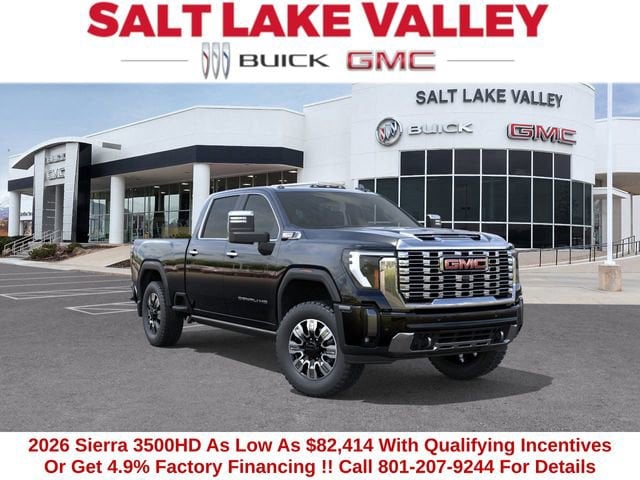 2026 GMC Sierra 3500HD Denali 4D Crew Cab Onyx Black Duramax 6.6L V8 Turbodiesel 4WD --- Please note that the final selling price does not include tax, tag, title, documentation fees, dealer-installed options, or pricing adjustments due to market demand. Financing through GM Financial is required for all discounts to be applied. Special finance offers may not be combined with some factory incentives. While we strive for accuracy, errors may occur, so please verify all information with a customer service representative. For the most accurate pricing, call us at (801) 265-1511 or visit our dealership in person. Prices and payments are subject to change based on manufacturer incentives. ... Sale Price may include dealer discount, $500 - Buick & GMC Consumer Cash Program - Price includes $2,000 Down Payment Assistance. Must Finance with GM Financial Price includes $1,500 Trade-In Allowance for customers trading a 2019 or newer passenger car or truck with under 80,000 miles toward a new 2025 2026 Buick or GMC. Branded or salvage title vehicles do not qualify. Some restrictions apply. See dealer for details.