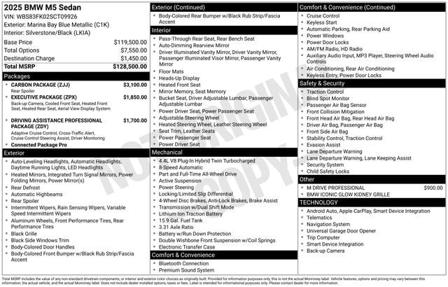Take your drives to the next level with this BMW M5 from Salt Lake Valley Buick GMC! Engineered for a smooth ride, advanced convenience, and lasting dependability, this vehicle is ready to handle everything your day throws at you. Price excludes tax, title, license fee, government fees, and $449 dealer documentary service fee. While every reasonable effort is made to ensure accuracy, we are not responsible for errors or omissions, and vehicles may be sold prior to inquiry please contact the dealer to confirm availability. All financing is subject to approved credit. Looking for quality used cars in Salt Lake City? This BMW M5 delivers style, versatility, and value - perfect for daily commutes, family trips, or weekend adventures. Stop by Salt Lake Valley Buick GMC to see this vehicle in person and explore our wide selection of pre-owned cars, trucks, and SUVs. Browse online at www.slvbuickgmc.com or call 801-265-1511 to schedule your test drive today! With Carbon Package, Connected Package Pro, Driving Assistance Professional Package (Active Driving Assistant Pro), Executive Package (BMW Iconic Glow Kidney Grille, Front & Rear Heated Seats, Front Ventilated Seats, Interior Camera, Parking Assistant Plus, and Power Rear Sunshade & Rear Side Window Shades), M Carbon Exterior Package (Carbon Fiber Reinforced Polymer Roof, Mirror Caps, and Spoiler), 18 Speakers, 4-Wheel Disc Brakes, ABS brakes, Adaptive suspension, Air Conditioning, Alloy wheels, AM/FM radio: SiriusXM, Apple CarPlay & Android Auto Compatibility, Auto High-beam Headlights, Auto tilt-away steering wheel, Auto-dimming door mirrors, Auto-dimming Rear-View mirror, Automatic temperature control, BMW Assist eCall, BMW Curved Display w/HUD, BMW TeleServices, Bowers & Wilkins Surround Sound, Brake assist, Bumpers: body-color, ConnectedDrive Services, Delay-off headlights, Driver door bin, Driver vanity mirror, Dual front impact airbags, Dual front side impact airbags, Electronic Stability Control, Emergency communication system: BMW Assist eCall, Extended Merino Leather Upholstery, Exterior Parking Camera Rear, Four wheel independent suspension, Front anti-roll bar, Front Bucket Seats, Front Center Armrest, Front dual zone A/C, Front reading lights, Fully automatic headlights, Garage door transmitter, Heads-Up Display, Heated door mirrors, Heated Front Seats, Heated front seats, Heated steering wheel, Illuminated entry, Leather steering wheel, Low tire pressure warning, M Drive Professional, M Multi-Function Seats, Memory seat, Navigation System, Occupant sensing airbag, Outside temperature display, Overhead airbag, Panic alarm, Passenger door bin, Passenger vanity mirror, Personal eSIM 5G, Power door mirrors, Power driver seat, Power Front Seats, Power passenger seat, Power steering, Power windows, Radio data system, Radio: AM/FM Audio System, Rain sensing wipers, Rear air conditioning, Rear anti-roll bar, Rear dual zone A/C, Rear reading lights, Rear seat center armrest, Rear window defroster, Remote keyless entry, Security system, SiriusXM Satellite Radio w/1-Year Subscription, Speed control, Speed-sensing steering, Speed-Sensitive Wipers, Split folding rear seat, Sport steering wheel, Steering wheel memory, Steering wheel mounted audio controls, Tachometer, Telescoping steering wheel, Tilt steering wheel, Traction control, Trip computer, Turn signal indicator mirrors, Variably intermittent wipers, Wheels: 20 x 10.5 Fr & 21 x 11 Rr Dual-Spoke, Wheels: 20 x 10.5 Fr & 21 x 11 Rr M Dual-Spoke, and Wireless Device Charging designed for convenience and enjoyment, this BMW M5 is ready to take you wherever you want to go.