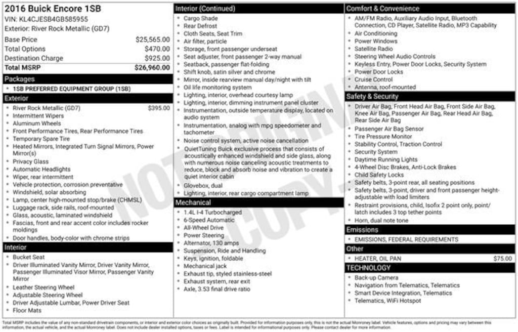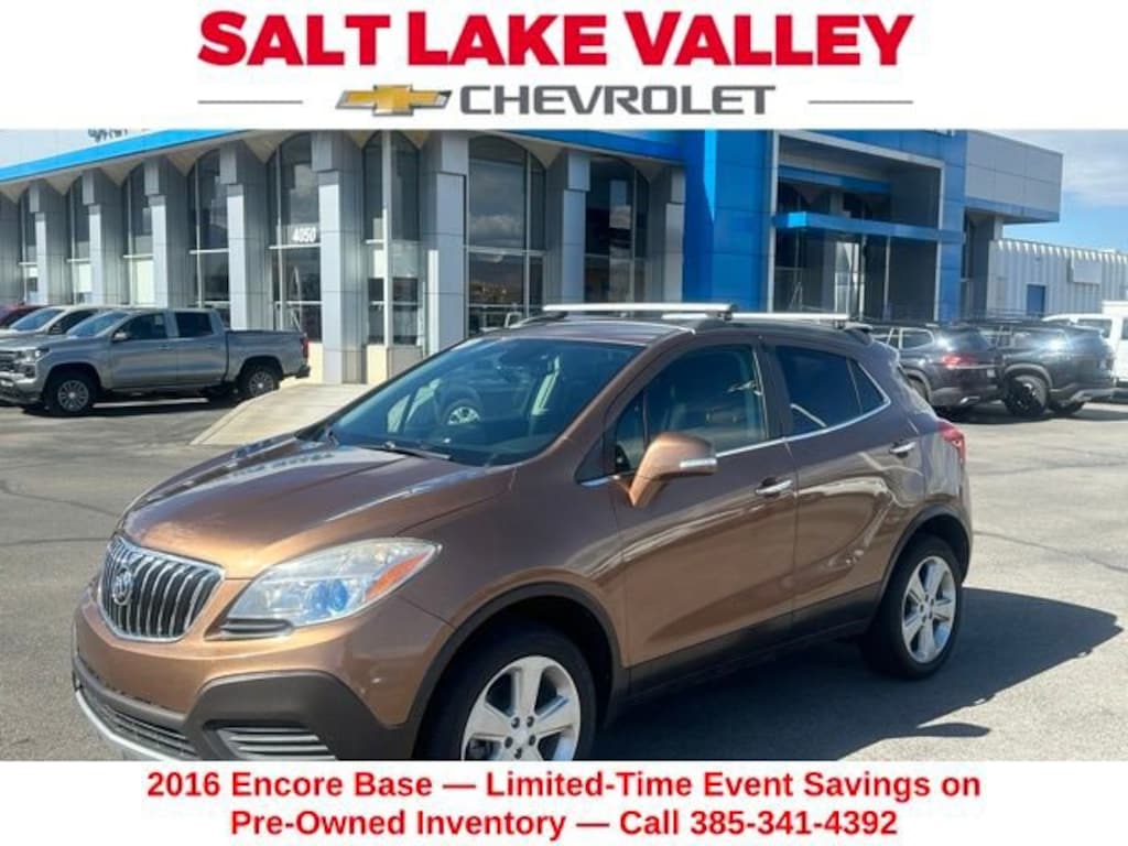 Turn every drive into something special with this Buick Encore from Salt Lake Valley Chevrolet! Designed for comfort, performance, and style, this vehicle comes fully equipped with modern technology and convenience features youâll love. Plus, enjoy a $1,000 finance savings, already included in the sale price, when you finance through one of our trusted lending partners. If youâre shopping for used cars in Salt Lake City, or searching for the perfect SUV, truck, or sedan, this Buick Encore delivers the dependability and value youâre looking for. Itâs the ideal match for your lifestyle - ready for everything from mountain adventures to city commutes. Visit Salt Lake Valley Chevrolet today and see why so many Utah drivers trust us for great deals on quality pre-owned vehicles. Explore our inventory online at www.slvchevy.com or call 801-969-8221 to schedule your test drive today! This impressive vehicle includes Preferred Equipment Group 1SB, 2-Way Manual Front Passenger Seat Adjuster, 3.53 Final Drive Axle Ratio, 4-Wheel Disc Brakes, 6 Speakers, 6-Way Power Driver Seat Adjuster, ABS brakes, Air Conditioning, Alloy wheels, AM/FM radio: SiriusXM, Brake assist, Bumpers: body-color, CD player, Compass, Delay-off headlights, Driver door bin, Driver vanity mirror, Driver's Seat Mounted Armrest, Dual front impact airbags, Dual front side impact airbags, Electronic Stability Control, Emergency communication system: OnStar Guidance, Exterior Parking Camera Rear, Front anti-roll bar, Front Bucket Seats, Front reading lights, Front wheel independent suspension, Fully automatic headlights, Heated door mirrors, Illuminated entry, Knee airbag, Leather steering wheel, Low tire pressure warning, Occupant sensing airbag, Oil Pan Heater, Outside temperature display, Overhead airbag, Panic alarm, Passenger door bin, Passenger vanity mirror, Power door mirrors, Power driver seat, Power steering, Power windows, Premium audio system: IntelliLink, Radio data system, Radio: AM/FM Audio System w/MP3 CD Player, Rear seat center armrest, Rear side impact airbag, Rear window defroster, Rear window wiper, Remote keyless entry, Ride & Handling Suspension, Roof rack: rails only, Security system, SiriusXM Satellite Radio, Speed control, Speed-sensing steering, Split folding rear seat, Spoiler, Steering wheel mounted audio controls, Tachometer, Telescoping steering wheel, Tilt steering wheel, Traction control, Trip computer, Turn signal indicator mirrors, Upscale Cloth w/Leatherette Accents Seat Trim, Variably intermittent wipers, and Wheels: 18 5-Spoke Cast Aluminum, offering everything you need for your next adventure.