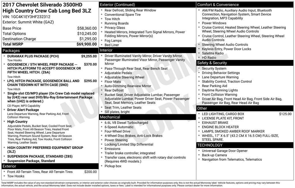Summit White 2017 Chevrolet Silverado 3500HD High Country 4WD Allison 1000 6-Speed Automatic Duramax 6.6L V8 Turbodiesel Allison 1000 6-Speed Automatic, 4WD, Jet Black Medium Ash Gray Piping Stitching Leather.Recent Arrival! Odometer is 17699 miles below market average!Price excludes tax, title, license fee, government fees, and $449 dealer documentary service fee. While every reasonable effort is made to ensure accuracy, we are not responsible for errors or omissions. Vehicles may be sold prior to inquiry. Please contact dealer to confirm availability. Vehicles listed as Not in Stock may be available within a reasonable timeframe, not to exceed one week. All financing is subject to approved credit. Check out our 5 Star Google Reviews! Drive a little save a lot. Awards:* 2017 KBB.com 10 Most Awarded Brands
