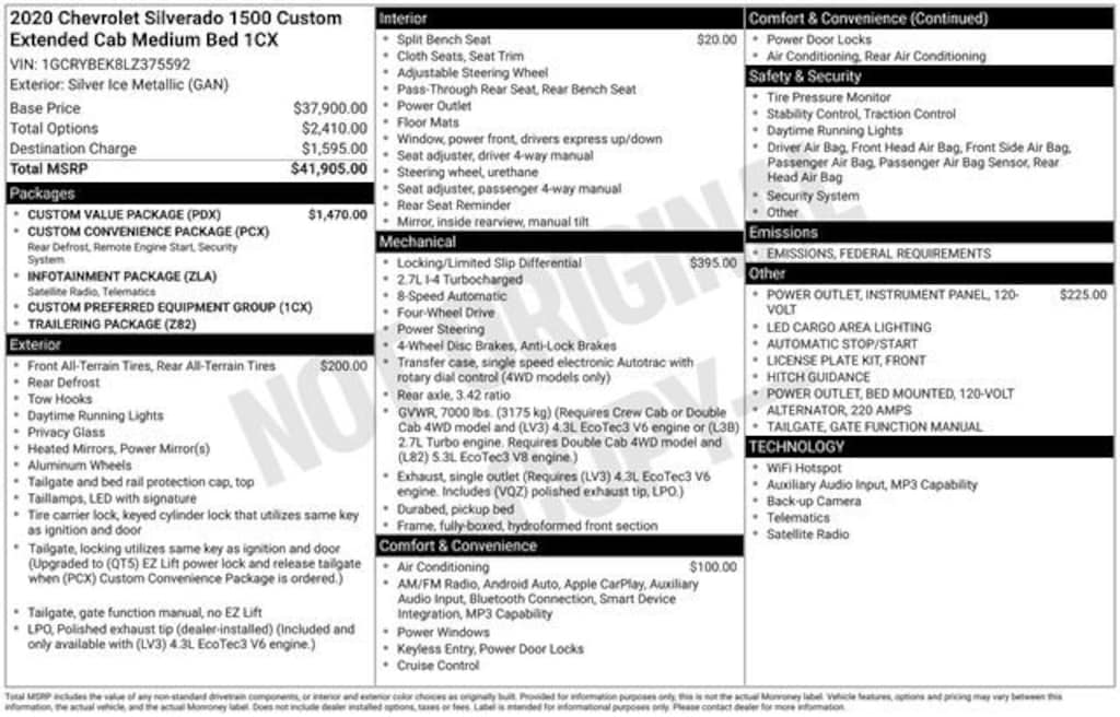 Turn every drive into something special with this Chevrolet Silverado 1500 from Salt Lake Valley Chevrolet! Designed for comfort, performance, and style, this vehicle comes fully equipped with modern technology and convenience features youâll love. Plus, enjoy a $1,000 finance savings, already included in the sale price, when you finance through one of our trusted lending partners. If youâre shopping for used cars in Salt Lake City, or searching for the perfect SUV, truck, or sedan, this Chevrolet Silverado 1500 delivers the dependability and value youâre looking for. Itâs the ideal match for your lifestyle - ready for everything from mountain adventures to city commutes. Visit Salt Lake Valley Chevrolet today and see why so many Utah drivers trust us for great deals on quality pre-owned vehicles. Explore our inventory online at www.slvchevy.com or call 801-969-8221 to schedule your test drive today! This impressive vehicle includes Custom Convenience Package (Electric Rear-Window Defogger, EZ Lift Power Lock & Release Tailgate, LED Cargo Area Lighting, Remote Vehicle Starter System, and Theft Deterrent System (Unauthorized Entry)), Custom Value Package, Infotainment Package (4G LTE Wi-Fi Hot Spot Capable, Chevrolet Connected Access Capable, Compass, OnStar & Chevrolet Connected Services Capable, and SiriusXM Radio), Preferred Equipment Group 1CX (170 Amps Alternator, 3.5 Diagonal Monochromatic Display, Bluetooth® For Phone, Body Color Grille, Color-Keyed Carpeting Floor Covering, Deep-Tinted Glass, Front Frame-Mounted Black Recovery Hooks, Front Rubberized Vinyl Floor Mats, Locking Tailgate, Manual Tilt-Wheel Steering Column, Power Door Locks, Power Front Windows w/Driver Express Up/Down, Power Front Windows w/Passenger Express Down, Power Rear Windows w/Express Down, Rear 60/40 Folding Bench Seat (Folds Up), Rear Rubberized-Vinyl Floor Mats, Remote Keyless Entry, and Steering Wheel Mounted Electronic Cruise Control), Trailering Package (Hitch Guidance), 120-Volt Bed Mounted Power Outlet, 120-Volt Instrument Panel Power Outlet, 220 Amps Alternator, 3.42 Rear Axle Ratio, 4-Wheel Disc Brakes, 40/20/40 Front Split Bench Seat, 6 Speakers, ABS brakes, Air Conditioning, Alloy wheels, Apple CarPlay/Android Auto, Automatic Stop/Start, Brake assist, Bumpers: body-color, Cloth Seat Trim, Delay-off headlights, Driver door bin, Driver vanity mirror, Dual front impact airbags, Dual front side impact airbags, Electronic Stability Control, Exterior Parking Camera Rear, Front 40/20/40 Split-Bench Seat, Front anti-roll bar, Front Center Armrest, Front License Plate Kit, Front reading lights, Front wheel independent suspension, Fully automatic headlights, Heated door mirrors, Heavy Duty Suspension, Heavy-Duty Rear Locking Differential, Illuminated entry, Low tire pressure warning, Occupant sensing airbag, Outside temperature display, Overhead airbag, Overhead console, Panic alarm, Passenger door bin, Passenger vanity mirror, Polished Exhaust Tip, Power door mirrors, Power steering, Power windows, Radio data system, Radio: Chevrolet Infotainment 3 System, Rear reading lights, Rear step bumper, Remote keyless entry, Single-Zone Manual/Semi-Automatic Air Conditioning, Speed control, Speed-sensing steering, Split folding rear seat, Tachometer, Tilt steering wheel, Traction control, Trip computer, Variably intermittent wipers, Voltmeter, and Wheels: 20 x 9 Bright Silver Painted Aluminum, offering everything you need for your next adventure.CARFAX One-Owner.