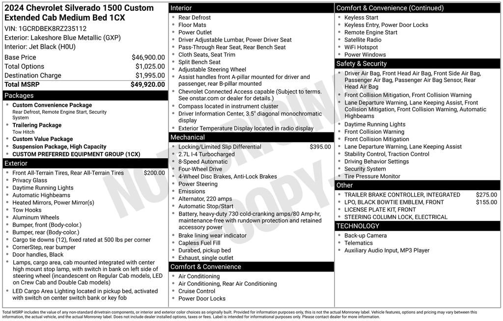 Lakeshore Blue Metallic 2024 Chevrolet Silverado 1500 Custom 4WD 8-Speed Automatic 2.7L I4 Turbocharged DOHC 16V LEV3-SULEV30 310hp 8-Speed Automatic, 4WD, Black Cloth.
