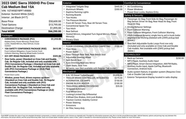 Get ready to hit the road in this GMC Sierra 3500HD, a standout choice for drivers looking for reliability, performance, and style! This impressive vehicle is packed with premium features designed to make every drive more enjoyable. Price excludes tax, title, license fee, government fees, and $449 dealer documentary service fee. While every reasonable effort is made to ensure accuracy, we are not responsible for errors or omissions, and vehicles may be sold prior to inquiryâ"please contact the dealer to confirm availability. All financing is subject to approved credit. Whether youâre searching for used cars in Salt Lake City, a dependable SUV, or a powerful truck, this GMC Sierra 3500HD delivers everything you need and more. Visit Salt Lake Valley Chrysler Dodge Jeep Ram today to test drive or explore our entire selection of quality pre-owned vehicles. Donât wait - shop online at www.slvcdjr.com or call 801-484-8755 to learn more! This amazing vehicle comes loaded with options like 1SA Safety Confidence Package (4.2" Diagonal Color Display Driver Info Center, Automatic Emergency Braking, Forward Collision Alert, Steering Wheel Audio Controls, and Steering Wheel-Mounted Cruise Control), Convenience Package (Deep-Tinted Glass, Electric Rear-Window Defogger, EZ Lift Power Lock & Release Tailgate, LED Cargo Area Lighting, Outside Power-Adjustable Black Mirrors, and Remote Keyless Entry), Preferred Equipment Group 1SA (2-Speed Electronic Shift Transfer Case, Chrome Surround Grille w/Black Mesh, Power Rear Windows w/Express Down, and Solar Absorbing Tinted Glass), Suspension Package, X31 Off-Road Package (Hill Descent Control and Off-Road Suspension), 18" Machined Aluminum Wheels, 220 Amp Alternator, 4-Way Manual Driver Seat Adjuster, 4-Way Manual Passenger Seat Adjuster, 4-Wheel Disc Brakes, 6 Speakers, 6-Speaker Audio System Feature, ABS brakes, Air Conditioning, AM/FM radio, Apple CarPlay/Android Auto, Bed View Camera, Brake assist, Bumpers: chrome, Color-Keyed Carpeting Floor Covering, Delay-off headlights, Driver door bin, Dual front impact airbags, Dual front side impact airbags, Electronic Stability Control, Engine Block Heater, Exhaust Brake, Front 40/20/40 Split-Bench Seats, Front anti-roll bar, Front Center Armrest w/Storage, Front License Plate Kit, Front reading lights, Front Rubberized Vinyl Floor Mats, Front wheel independent suspension, Fully automatic headlights, GMC MultiPro Tailgate, Heavy-Duty 80 Amp Battery, Inside Rear-View Auto-Dimming Mirror, Integrated Trailer Brake Controller, Low tire pressure warning, Occupant sensing airbag, Outside temperature display, Overhead airbag, Overhead console, Passenger door bin, Passenger vanity mirror, Pickup Bed, Power steering, Power windows, Premium audio system: GMC Infotainment System, Radio: AM/FM w/GMC Infotainment System, Rear reading lights, Rear Rubberized-Vinyl Floor Mats, Rear step bumper, Split folding rear seat, Tachometer, Tilt steering wheel, Traction control, Trip computer, Variably intermittent wipers, Vinyl Seat Trim, Voltmeter, Wheels: 18" Silver 8-Spoke Painted Steel, and Winter Grille Cover, making it the perfect choice for your next adventure.