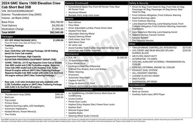 Take your drives to the next level with this GMC Sierra 1500 from Salt Lake Valley Buick GMC! Engineered for a smooth ride, advanced convenience, and lasting dependability, this vehicle is ready to handle everything your day throws at you. Plus, enjoy a $1,000 finance savings, already included in the sale price, when you finance through one of our trusted lending partners. Looking for quality used cars in Salt Lake City? This GMC Sierra 1500 delivers style, versatility, and value - perfect for daily commutes, family trips, or weekend adventures. Stop by Salt Lake Valley Buick GMC to see this vehicle in person and explore our wide selection of pre-owned cars, trucks, and SUVs. Browse online at www.slvbuickgmc.com or call 801-265-1511 to schedule your test drive today! With Cloth Rear Seat w/Storage Package, High Capacity Suspension Package, Preferred Equipment Group 3SB (120-Volt Bed Mounted Power Outlet, 120-Volt Interior Power Outlet, 2 Charge/Data USB Ports, 2 Type-C Charge-Only Rear USB Ports, 6-Speaker Audio System Feature, Auto-Locking Rear Differential, Body Color Header w/Gloss Black Mesh Grille Bars, Color-Keyed Carpeting Floor Covering, Deep-Tinted Glass, Electric Rear-Window Defogger, Front Frame-Mounted Black Recovery Hooks, Front Rubberized-Vinyl Floor Mats, GMC Connected Access Capable, HD Rear Vision Camera, Keyless Open & Start, LED Cargo Area Lighting, Manual Tilt-Wheel & Telescoping Steering Column, OnStar & GMC Connected Services Capable, Power Door Locks, Power Front Windows w/Driver Express Up/Down, Power Front Windows w/Passenger Express Down, Power Rear Windows w/Express Down, Push Button Start, Rear Rubberized-Vinyl Floor Mats, Remote Vehicle Starter System, SiriusXM w/360L, Steering Wheel Audio Controls, Theft Deterrent System (Unauthorized Entry), and Wi-Fi Hotspot Capable), Trailering Package (Hitch Guidance), X31 Off-Road Package (Dual Exhaust System, Heavy-Duty Air Filter, Hill Descent Control, Off-Road Suspension, Rear Wheelhouse Liners, and X31 Hard Badge), 10-Way Power Driver Seat Adjuster w/Lumbar, 170 Amp Alternator, 220 Amp Alternator, 4-Way Manual Passenger Seat Adjuster, 4-Wheel Disc Brakes, 6 Speakers, ABS brakes, Air Conditioning, Alloy wheels, AM/FM radio: SiriusXM with 360L, Apple CarPlay/Android Auto, Auto High-beam Headlights, Automatic Emergency Braking, Automatic temperature control, Auxiliary External Transmission Oil Cooler, Brake assist, Buckle to Drive, Bumpers: body-color, Cloth Seat Trim, Compass, Delay-off headlights, Driver door bin, Driver vanity mirror, Dual front impact airbags, Dual front side impact airbags, Electronic Stability Control, External Engine Oil Cooling, Following Distance Indicator, Forward Collision Alert, Front & Rear Black Molded Splash Guards (LPO), Front 40/20/40 Split-Bench Seat, Front anti-roll bar, Front Center Armrest w/Storage, Front dual zone A/C, Front fog lights, Front License Plate Kit, Front Pedestrian Braking, Front reading lights, Front wheel independent suspension, Fully automatic headlights, Genuine wood dashboard insert, Heated door mirrors, Heated Driver & Front Outboard Passenger Seating, Heated front seats, Heated steering wheel, Illuminated entry, Integrated Trailer Brake Controller, IntelliBeam Automatic High Beam On/Off, Lane Keep Assist w/Lane Departure Warning, Low tire pressure warning, Navigation System, Occupant sensing airbag, Outside temperature display, Overhead airbag, Overhead console, Panic alarm, Passenger door bin, Passenger vanity mirror, Power door mirrors, Power driver seat, Power steering, Power windows, Premium audio system: GMC Infotainment System, Radio data system, Radio: Premium GMC Infotainment Audio System, Rear reading lights, Rear seat center armrest, Rear step bumper, Rear window defroster, Remote keyless entry, Security system, Speed control, Speed-sensing steering, Split folding rear seat, Spray-On Pickup Bedliner w/GMC Logo, Standard Tailgate, Steering w