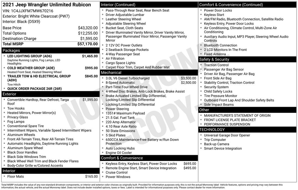 This 2021 Jeep Wrangler Unlimited Rubicon is a true off-road icon, blending exceptional capability, premium features, and a timeless design. Don't miss the opportunity to make this rugged and capable Jeep your own. Contact us today to schedule a test drive and experience the thrill of owning this exceptional vehicle.