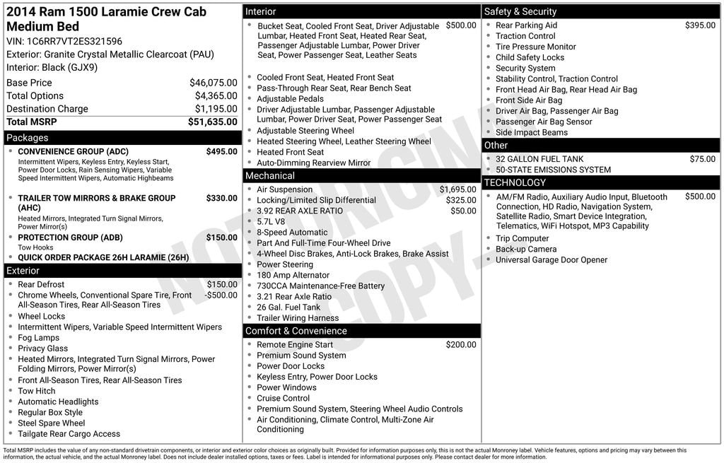 Granite Crystal Metallic Clearcoat 2014 Ram 1500 Laramie 4WD 8-Speed Automatic HEMI 5.7L V8 Multi Displacement VVTRecent Arrival! Odometer is 23224 miles below market average!Awards:* Motor Trend Automobiles of the yearReviews:* If you want the only full-size pickup (so far) with the fuel economy of a smaller-displacement diesel engine yet all the pulling and working power you’d expect, the 2014 Ram 1500 is for you. Source: KBB.com* Supple ride and composed handling; strong gas V6 or fuel-efficient diesel V6 available; available eight-speed automatic transmission improves fuel economy and towing abilities; refined and quiet cabin; useful tech features. Source: EdmundsCheck out our 5 Star Google Reviews! Drive a little save a lot. Sale Price Includes $1,000 Finance Savings. Contact Dealer For Details.