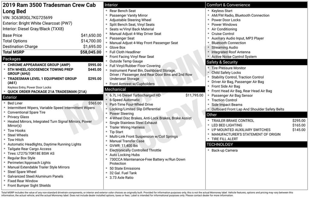 Bright White Clearcoat 2019 Ram 3500 Tradesman 4WD Aisin 6-Speed Automatic 6.7L I6