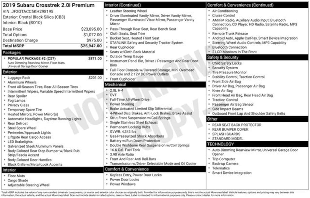 - Radio: Subaru Starlink 6.5" Multimedia Plus System