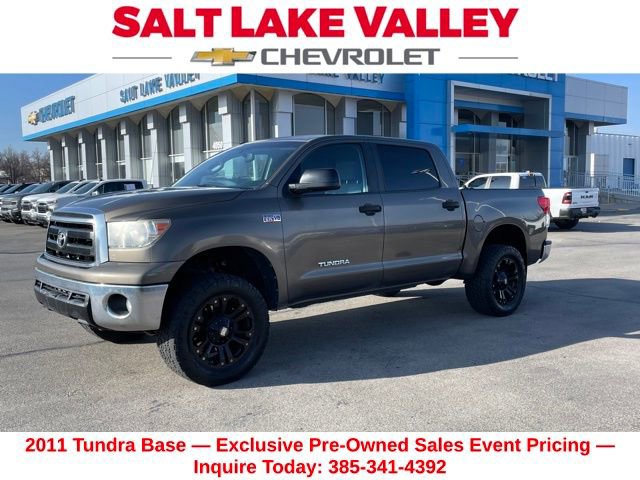 Turn every drive into something special with this Toyota Tundra from Salt Lake Valley Chevrolet! Designed for comfort, performance, and style, this vehicle comes fully equipped with modern technology and convenience features youâll love. Plus, enjoy a $1,000 finance savings, already included in the sale price, when you finance through one of our trusted lending partners. If youâre shopping for used cars in Salt Lake City, or searching for the perfect SUV, truck, or sedan, this Toyota Tundra delivers the dependability and value youâre looking for. Itâs the ideal match for your lifestyle - ready for everything from mountain adventures to city commutes. Visit Salt Lake Valley Chevrolet today and see why so many Utah drivers trust us for great deals on quality pre-owned vehicles. Explore our inventory online at www.slvchevy.com or call 801-969-8221 to schedule your test drive today! This impressive vehicle includes 18 x 8J Alloy Disc Wheels, 18 x 8J Steel Wheels, 3-Passenger Front Bench Seat, 4-Wheel Disc Brakes, 4.10 Axle Ratio, 6 Speakers, ABS brakes, Air Conditioning, AM/FM radio, AM/FM w/CD Player, Brake assist, Bumpers: chrome, CD player, Compass, Driver door bin, Driver vanity mirror, Dual front impact airbags, Dual front side impact airbags, Electronic Stability Control, Fabric Seat Trim, Front anti-roll bar, Front Bucket Seats, Front Center Armrest w/Storage, Front dual zone A/C, Front reading lights, Front wheel independent suspension, Illuminated entry, Knee airbag, Low tire pressure warning, Occupant sensing airbag, Outside temperature display, Overhead airbag, Overhead console, Panic alarm, Passenger door bin, Passenger vanity mirror, Power door mirrors, Power steering, Power windows, Radio: JBL AM/FM 6-CD Changer, Rear reading lights, Rear seat center armrest, Rear step bumper, Rear window defroster, Remote keyless entry, Speed control, Speed-sensing steering, Split folding rear seat, Tachometer, Tilt steering wheel, Traction control, Variably intermittent wipers, and Voltmeter, offering everything you need for your next adventure.Awards:* 2011 KBB.com Brand Image Awards
