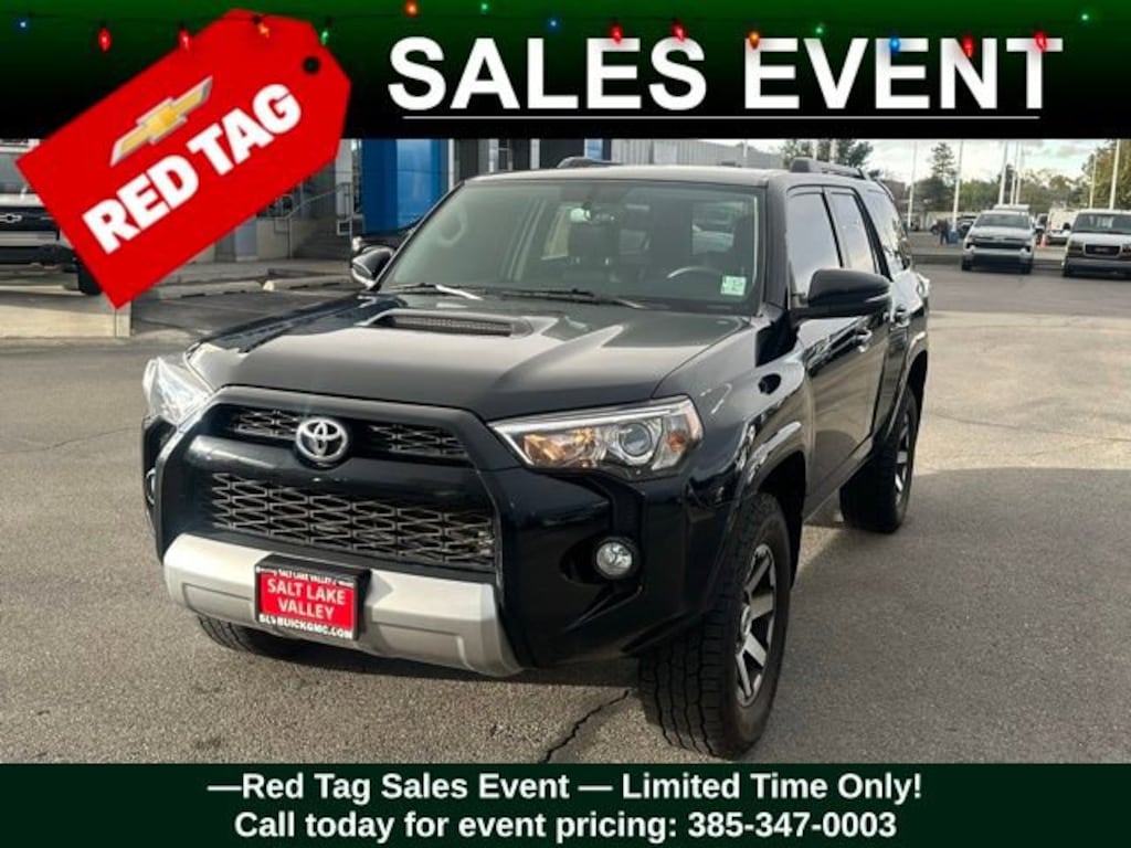This Toyota 4Runner is packed with all your favorite features and includes a $1,000 finance savings, already included into the sale price, when you finance through one of our trusted lending partners! Explore more quality vehicles at www.slvchevrolet.com or call 801-969-8221 today! Enjoy the great options on this 4Runner like 3.727 Axle Ratio, 4-Wheel Disc Brakes, 8 Speakers, ABS brakes, Air Conditioning, Alloy wheels, AM/FM radio: SiriusXM, Anti-whiplash front head restraints, Auto-Dimming Rear-View Mirror, Auto-dimming Rear-View mirror, Black Roof Rails, Body Color Heated Mirrors, Brake assist, Bumpers: body-color, CD player, Compass, Driver door bin, Driver vanity mirror, Dual front impact airbags, Dual front side impact airbags, Electronic Stability Control, Emergency communication system: Safety Connect, Exterior Parking Camera Rear, Front anti-roll bar, Front Bucket Seats, Front Center Armrest, Front fog lights, Front reading lights, Front wheel independent suspension, Garage Door Opener, Garage door transmitter: HomeLink, Heated door mirrors, Heated Front Bucket Seats, Heated front seats, Illuminated entry, Knee airbag, Leather Shift Knob, Low tire pressure warning, Moonroof w/Tilt Up & Slide, Navigation System, Occupant sensing airbag, Outside temperature display, Overhead airbag, Overhead console, Panic alarm, Passenger door bin, Passenger vanity mirror, Power door mirrors, Power driver seat, Power passenger seat, Power steering, Power windows, Radio: Entune Premium Audio w/Navigation, Rear anti-roll bar, Rear seat center armrest, Rear window defroster, Rear window wiper, Remote keyless entry, Roof rack: rails only, Security system, Softex Synthetic Leather Seat Trim, Speed control, Speed-sensing steering, Split folding rear seat, Spoiler, Steering wheel mounted audio controls, Tachometer, Telescoping steering wheel, Tilt steering wheel, Traction control, Trip computer, Turn signal indicator mirrors, Variably intermittent wipers, and Wheels: 17 x 7.5 7-Spoke Unique Off-Road Alloy.